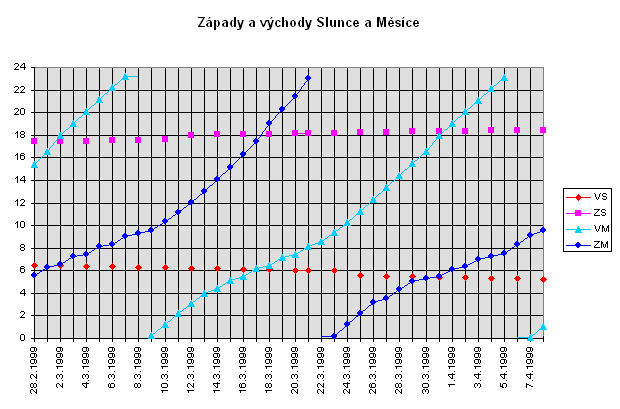 A ještě něco: od 28.3. platí letní čas (SELČ), takže k časovým údajům v SEČ, které zde uvádím, musíte přidat jednu hodinu, abyste dostali čas na vašich hodinkách.