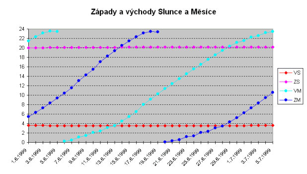 Závěrem přidávám obvyklé grafy a zdůrazňuji, že časy uvedené v grafech jsou středoevropské; abyste dostali středoevropský letní čas, musíte přičíst jednu hodinu.